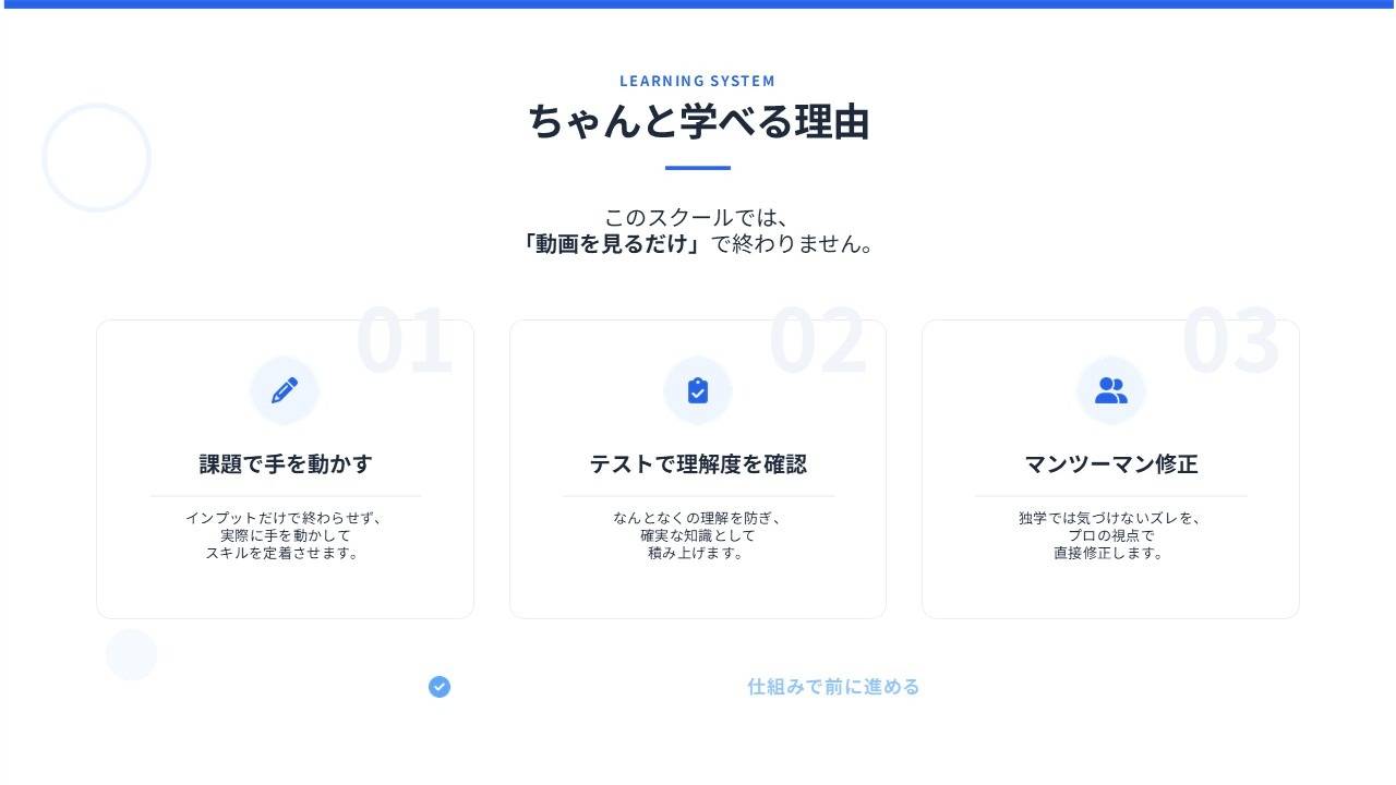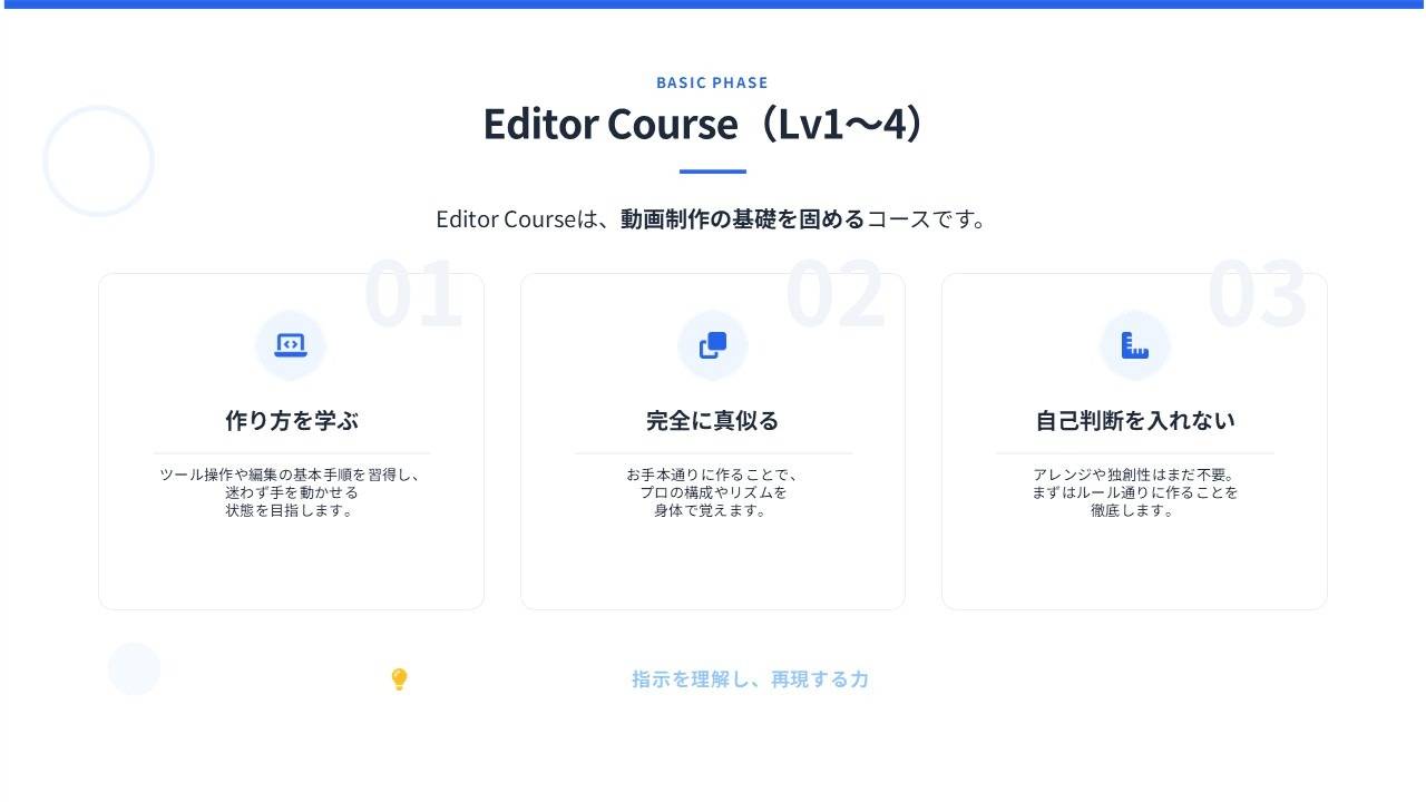 初心者も、一度動画を学んでうまくいかなかった人も自己流を一度すべて捨て、基礎から再構築する設計になっています。