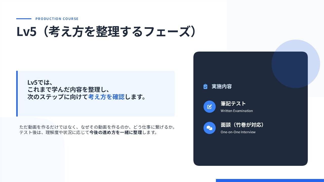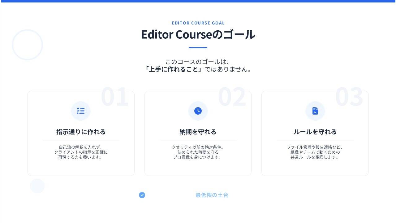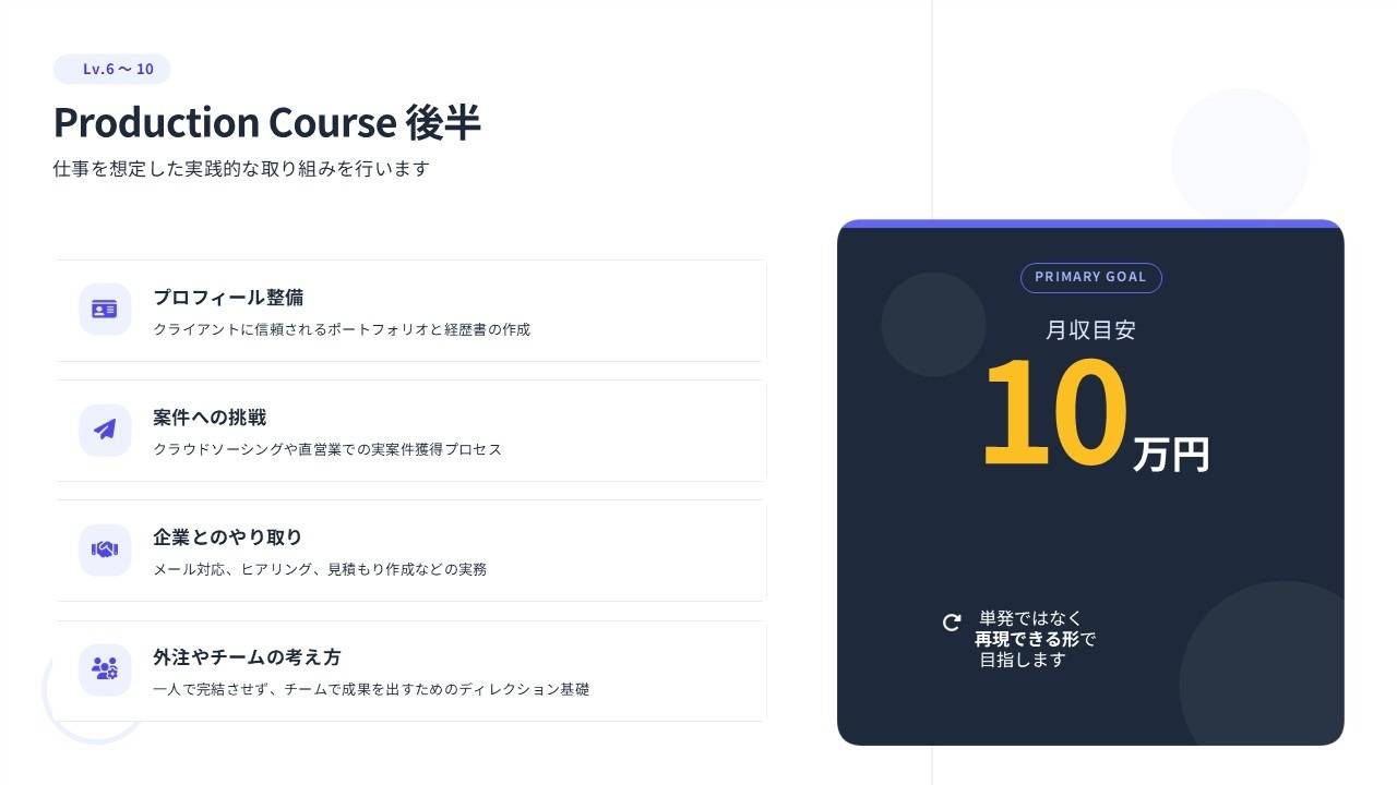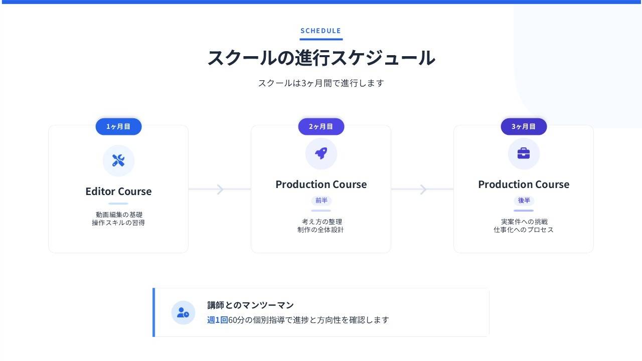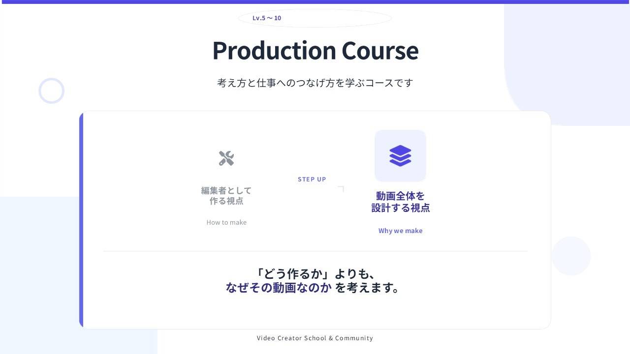 動画を仕事として成立させるための思考・判断・行動を段階的に身につけるためのスクールです。