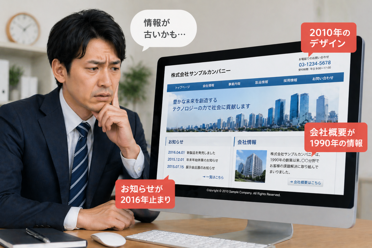 みなさんは自社のホームページをいつ作成したか、覚えていますか?「5年前」「10年前」という答えが返ってくることは珍しくありません。実は、ホームページの老朽化は、企業の印象低下だけでなく、営業機会の喪失につながる大きな問題なのです。今回は、ホームページのリニューアルが必要な時期と、その判断基準についてお話しします。古いホームページが企業に与える悪影響。ホームページは、24時間働く営業マンのような存在です。しかし、デザインが古い、動作が遅い、スマートフォンに対応していないホームページは、むしろ顧客を遠ざけてしまいます。